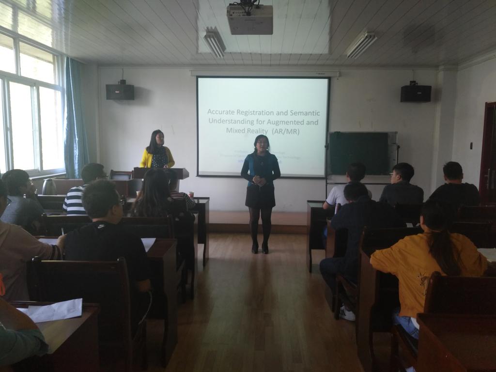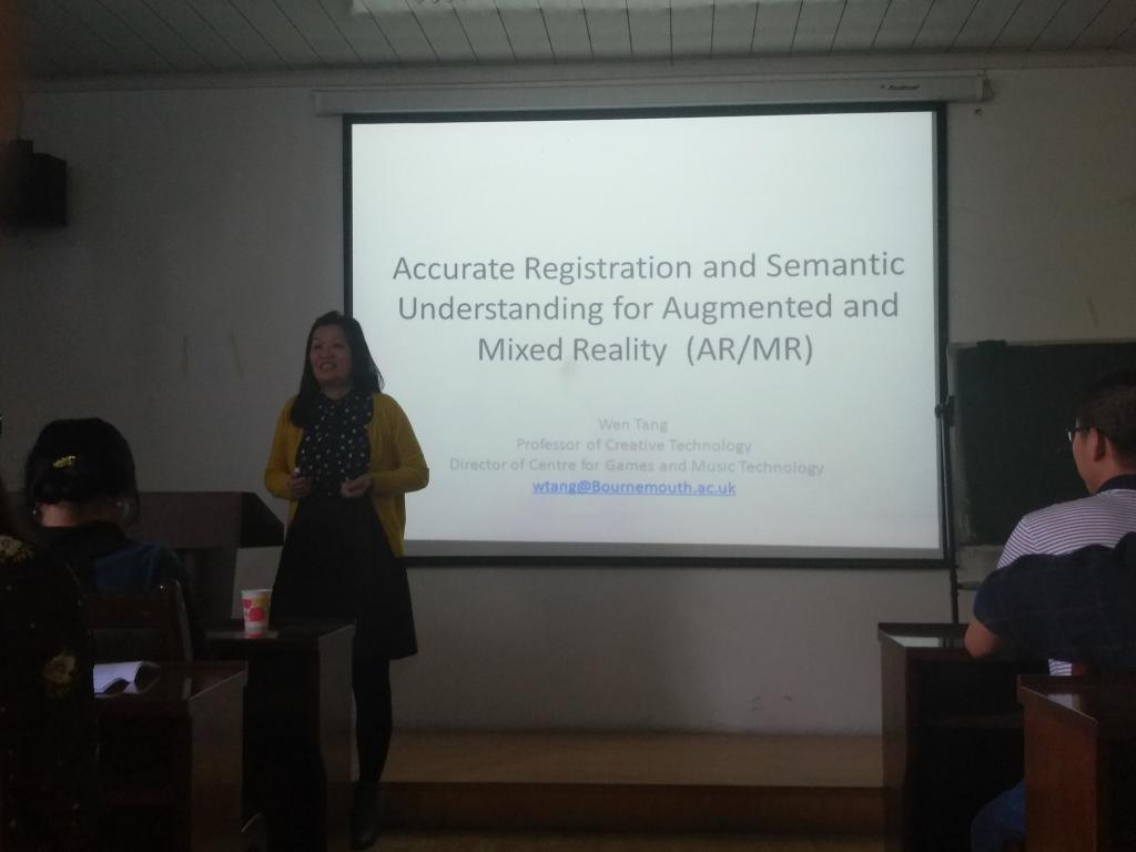4月2日,在金花校区机电楼407多媒体教室,电信学院特邀陕西省百人计划特聘教授、博士生导师汤汶教授做了主题为“AR/MR环境下的高精度虚实定位跟踪与语言分析技术简介”的学术报告会。本次报告由银河6163线路检测副院长李云红教授主持,电信学院教师代表和2017级研究生共100余人参加了本次讲座。