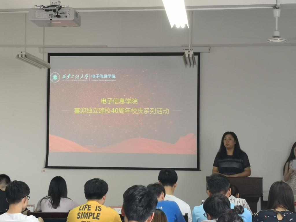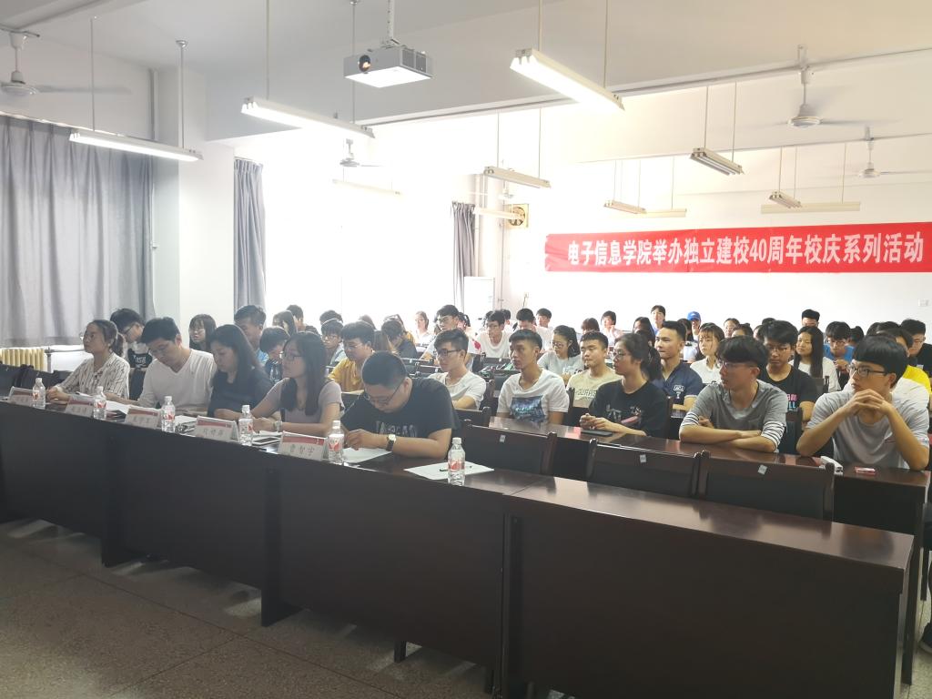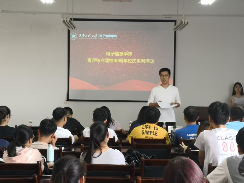 为更好的迎接我校独立建校40周年校庆,展示银河6163线路检测学子的精神风貌。电信学院于6月11日中午在临潼校区电信楼419会议室举办“喜迎我校独立建校40周年校庆系列活动”动员大会。电信学院学工办主任朱宇军、团总支书记刘妍萍、辅导员赵立涛、曹智宇、刘风萍及各班团支部成员,团学科全体学生干部参与本次活动。