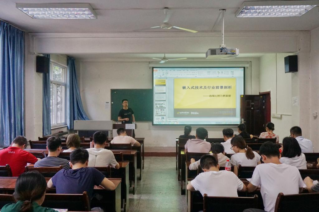 首先米晓超总监从嵌入式技术在智能家居和医疗器械中的应用作为例子让在场的同学了解嵌入式。接下来,进一步介绍了嵌入式的软件构架和硬件构架,让同学们了解嵌入式系统的整体结构。他特别提到研究生就业简历中,最重要的是个人技能和项目经验,这个特质是企业招聘人才最青睐的一项。最后米老师介绍了嵌入式的行业前景,并利用自己带来的开发板以及linux操作系统向同学们展示了嵌入式的实际应用。他从身边的实例出发,用通俗易懂的语言诠释了复杂的学术知识,同学们不由自主的点头称赞。