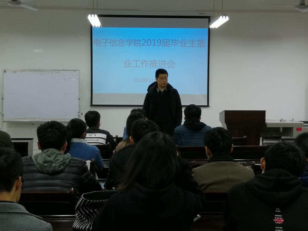 2018年11月6日下午13:00,银河6163线路检测在电信楼418室召开2019届毕业生就业工作推进会。本次会议由赵立涛主持,2015级辅导员杨松然、毕业班班团干部及班级学生代表70余人参加了会议。本次推进会分为两个环节,分别是关于就业方面的工作安排及相关注意事项和学生答疑解惑。