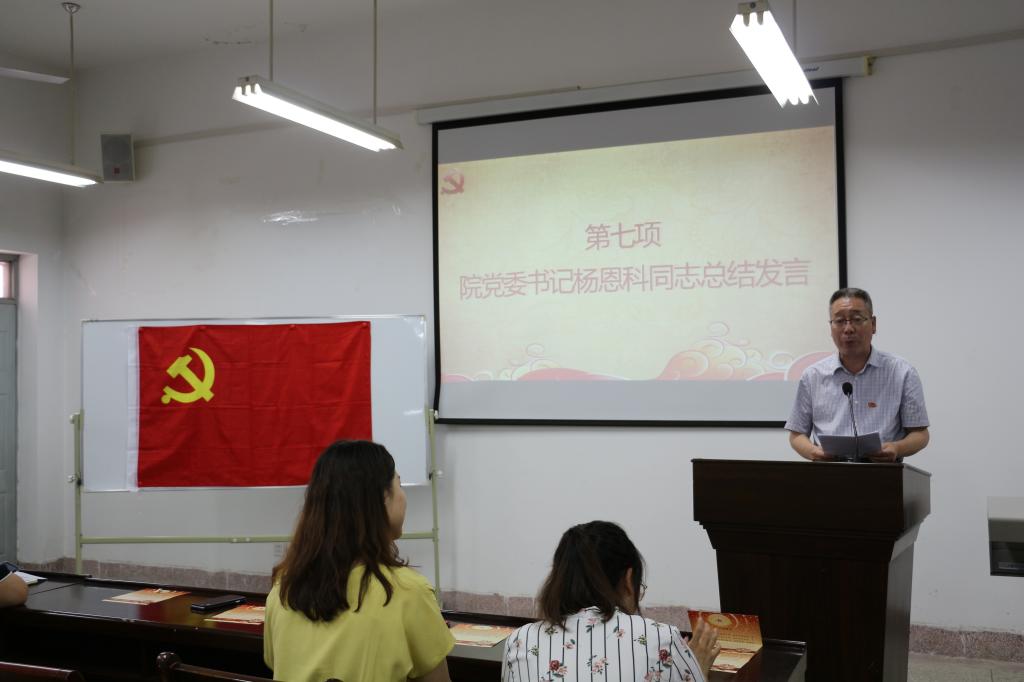 最后学院党委书记杨恩科做了总结发言。他代表学院党委向各基层党支部和全体党员表示诚挚的问候和衷心的感谢,为涌现出的所有先进表示祝贺。他表示:面对党旗回顾党的98年风雨历程,我们每一个党员都要永远记住入党宣誓这个神圣的时刻,激励自己终生践行入党誓言,为党的事业奋斗终身。对于每一名党员来说,做合格党员,是永远不变的命题。同时还对新党员提出了三点希望:一是要知党信党,立志成为一个有信念的人。作为大学生,要想入党,就要用心学马、习马、信马,读党史、明信念,在思想、工作、学习等方面要树立先锋模范的带头意识和服务意识,做到思想上先入党,补足精神之钙。二是要严于律己,立志成为一个有纪律的人。作为大学生,无论是入党还是不入党,都要常思、深思、慎思哪些该说,哪些不该说,哪些该做,哪些不该做。要坚持说实话、真话、有意义的话,而不说假话、官话、荒唐话和无原则又低品位的话,更不能说有损于党的形象、有悖于党的政策、与自己身份不相称的话。特别是互联网高速发展的时代,你们不仅要做好网络舆论的监督员,更要做好正向引导员。三是要奋斗不止,立志成为一个有作为的人。作为学生,坚持“勤勉求学 全面发展”就是在你的位置上奋斗;作为老师,坚持“履职尽责 立德树人”就是在你的位置上奋斗。请挽起袖子,俯下身子,不驰于空想,不骛于虚声,用不朽的“匠心”和稳扎稳打的“干劲”建功新时代。最后,他真心的祝愿每一位党员同志不负韶华,认真学习贯彻习近平新时代中国特色社会主义思想,树牢“四个意识”,增强“四个自信”,做到“两个维护”,以良好的精神状态,充足的干劲,为党旗添光加彩,为学院的发展做出更大的贡献,以优异成绩迎接党的98岁生日。(撰稿人:朱宇军 审核人:杨恩科)