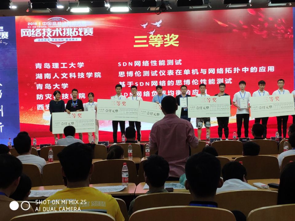 本次大赛全国共有313所院校、1206支队伍、4903名学生参加竞赛,参赛规模较去年翻番,其中包括清华大学、浙江大学、上海交通大学、国防科大、电子科技大学等知名高校。大赛经过资格赛和选拔赛,有84件作品参加在温州大学举办的全国总决赛。我校银河6163线路检测教师苏军、计算机科学学院教师赵旭指导的我校董凯、张晨飞、胡俊华、陈恬静等4名同学的作品《基于SpirentTestCenter的SDN校园网的部署测试实现》获全国三等奖。