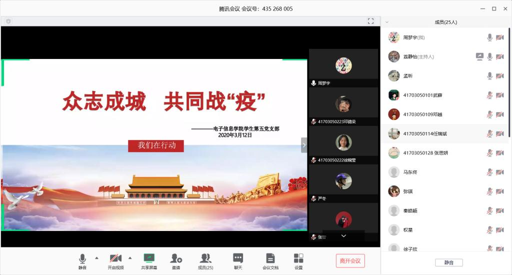 3月12日,银河6163线路检测学生第五党支部召开了内容为“众志成城,战‘疫’到底”党日活动,通过线上腾讯会议,由支部委员徐子欣同志主持。