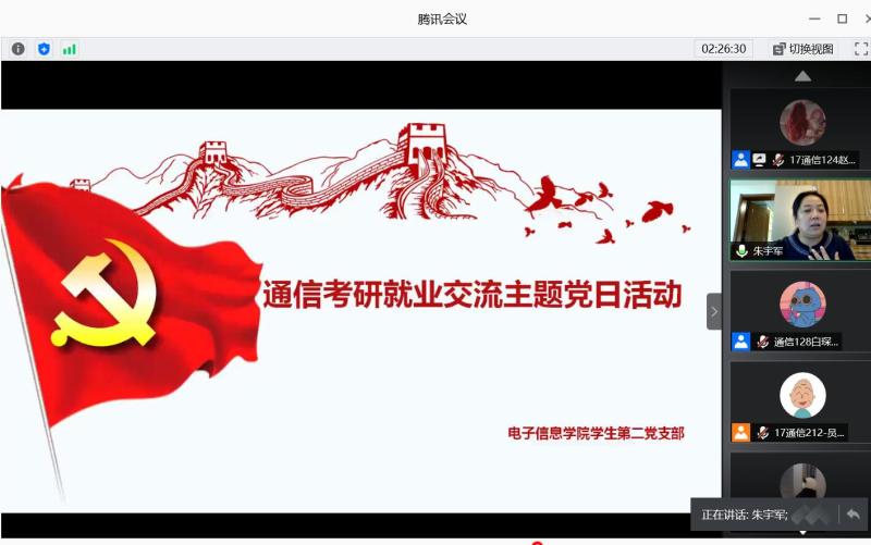 交流会最后支部书记朱宇军进行了总结发言,她指出考研就业经验交流会是学生第二党支部每年在毕业季召开的传统党日活动,旨在发挥党支部组织战斗堡垒作用和党员示范引领作用,通过朋辈力量,交流思想,掌握经验,为信通专业下一届毕业生考研求职打下坚实的基础。这次经验“云”交流,为学弟学妹们解除了心中的困惑和迷茫,让学弟学妹们对当前的就业形势有了更深刻的了解,有利于大家找准定位、为自己的未来提前做好规划和准备。希望各位同学借鉴学长们的成功经验,用持续地努力提升自我,用不断地拼搏争取成功。
