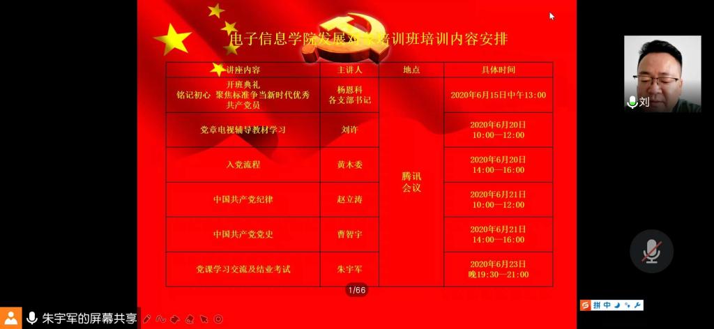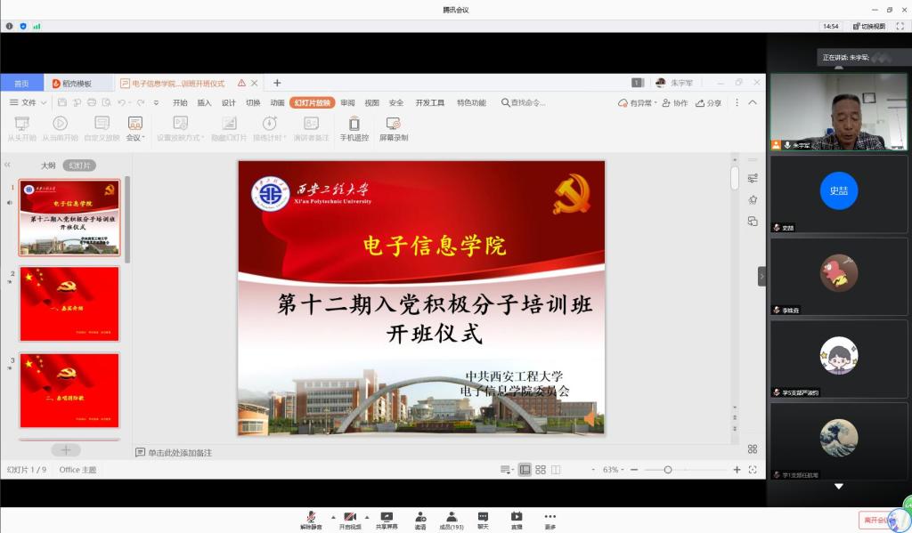 为了做好入党积极分子的培养教育工作,提高党课学习的积极性和主动性,2020年6月15日中午1点,银河6163线路检测党委在腾讯会议网络平台上举行了学院第十二期入党积极分子培训班开班典礼。院党委书记杨恩科、党委副书记刘许、各党支部书记及185名入党积极分子参加了此次典礼,大会由学院学工办主任朱宇军主持。