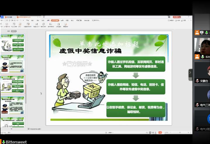 此次班会警示性强、教育性强、实用性强,使同学们更加深刻地认识了诈骗的各种类型和严重危害,明确了遇到类似情况应该如何妥善应对,提高了识别和防诈骗能力,增强了同学们在生活中的安全防范意识。(撰稿:周梦宇 张天 审核:杨恩科)