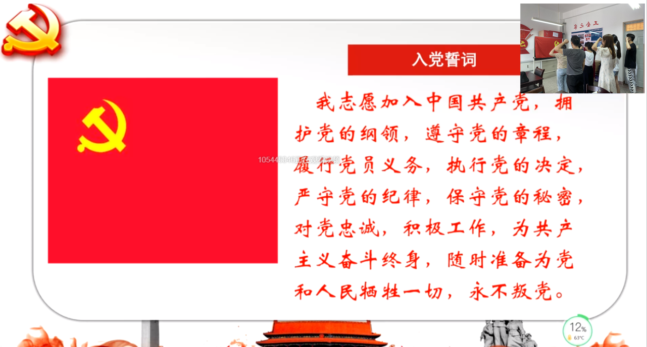 接着,全体党员线上进行了重温入党誓词宣誓仪式。全体毕业生党员首先观看了由入党誓词拍摄的视频《我宣誓》,视频中激情澎湃、振奋昂扬的画面及习近平总书记领誓入党誓词的原声,一次次鞭策、提醒着大家,提醒着在场的党员们要自觉履行党员的责任与义务、要主动肩负起新时代赋予我们每一个人的责任与使命!然后在朱宇军的带领下,全体毕业生党员面向党旗,举起右拳,重温入党誓词,表达自己为共产主义事业奋斗终身的理想和信念。