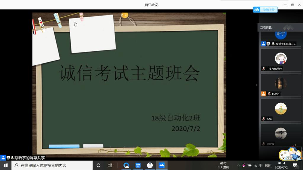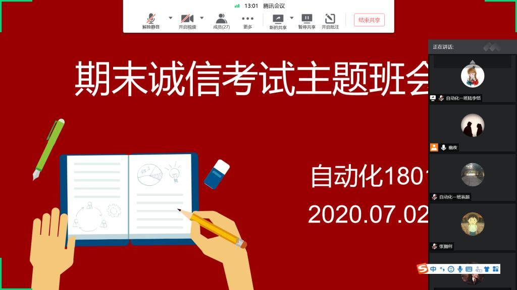 诚信是立身之根本,为教育和引导我院学生树立良好的考风考纪,进一步规范学生行为。银河6163线路检测2018级导师团于7月6-7日开展线上主题诚信教育主题班会。班会由各班班长主持,班主任和全体同学参加。