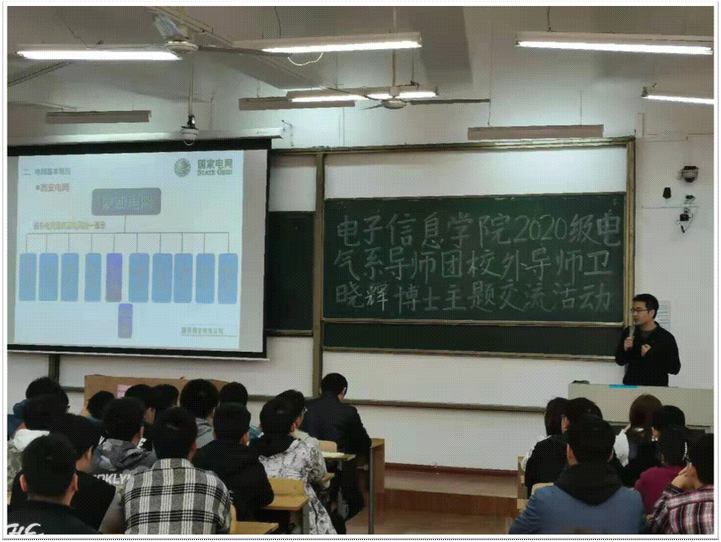 卫晓辉博士介绍了自己在国家电网西安供电公司的工作成长经历,介绍了陕西电网的具体构成和发展历程,同时以临潼区的某变电系统为例,为同学们解释了变电规模、供电网络主支交汇情况及输电规模的主要情况。现场同学们或思考、或交流、或提问,交流气氛浓厚。最后,卫博士围绕同学们提出的“怎样学习准备才能更好的适应国网的人才需求”等问题,为同学们进行了耐心的分析,并给予了行之有效的建议,一是一定要在学习专业知识上下绣花功夫,才能拥有进入行业领域的敲门砖;二是一定要在科技创新实践上下足气力,才能真正做到学以致用;三是一定要在综合能力提上下苦功,才能在行业内站得稳,走得远。