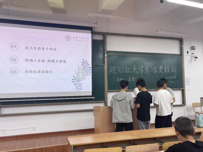 在“我与生涯有个约会"内容中,高黎老师引领全体同学参与人生纸条的小活动。通过活动的体验感知时间的珍贵以及做好规划的重要性。接着,在高老师对“明确小目标,构建大梦想”这部分内容的讲解中,同学们也更加意识到小目标的重要性,就如任何一栋高楼大厦的建成都是由一砖一瓦堆砌而成的。大梦想是建立在一个个小目标之上的,只有完成了一个个小目标才能实现大梦想。高黎老师提到明确小目标的核心在于对性格、兴趣、能力和价值观的内在探索以及对外部职业世界的探索。高黎老师引用习近平总书记在清华大学考察中所说的话"当代中国青年是与新时代同向同行、共同进步的一代,生逢盛世、肩负重任。"来勉励同学们去勇敢追逐自己的大梦想。
