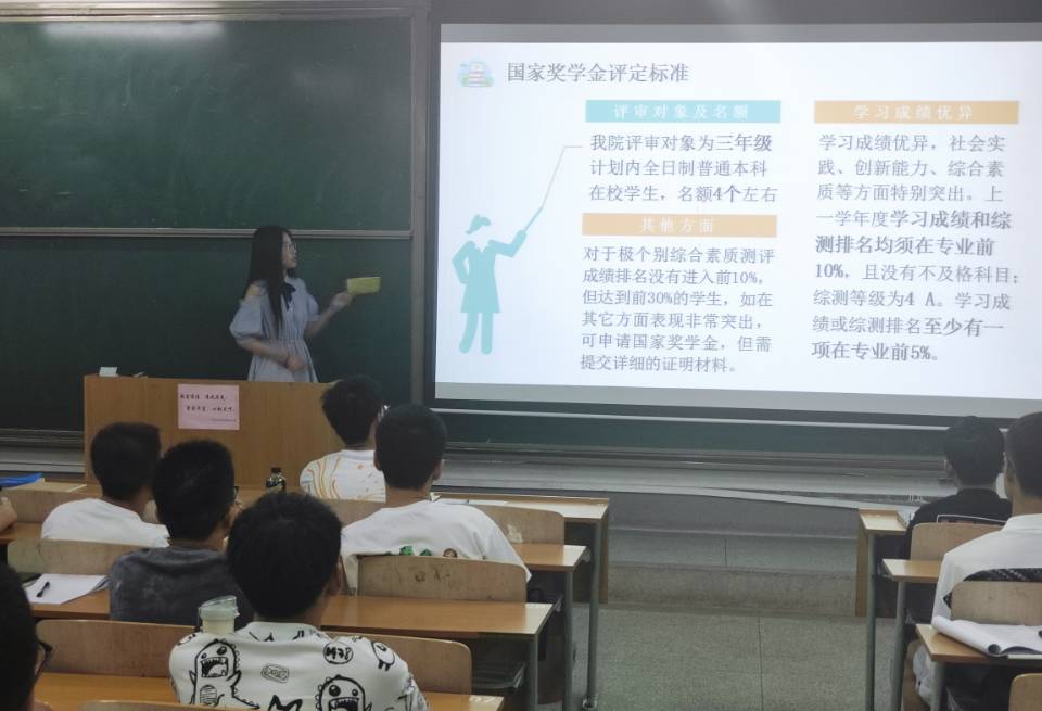 会议初,20级辅导员王家钰强调了参会纪律,同时介绍本次活动的主题和目的在于树立正确学习观念,向优秀国奖获得者学习。活动中,魏雨昕介绍了获得国奖的相关要求,并向同学们提出了个人在学习和生活上的建议,帮助同学们正确认识和了解如何度过有意义的大学生活,活动结束之前,对于同学们的疑点和问题,魏雨昕积极与同学们进行探讨并一一作了详尽解答。