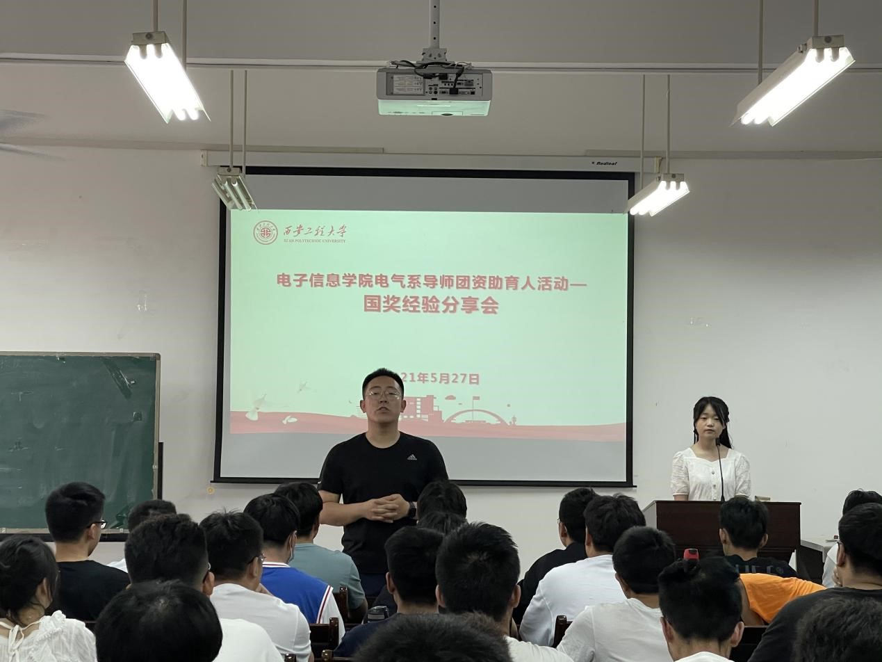 为更好地鼓励学生在校期间刻苦学习,奋发向上,锐意进取,德、智、体、美、劳等各方面全面发展,2021年5月27日下午2时30分,在电信楼419,电气系“三全育人导师团”资助育人活动-国奖宣讲会,参会人员为辅导员王家钰老师和周梦宇老师,18级、19级、20级电气专业部分学生。此次会议主讲人为18级电气专业国奖获得者张鑫。