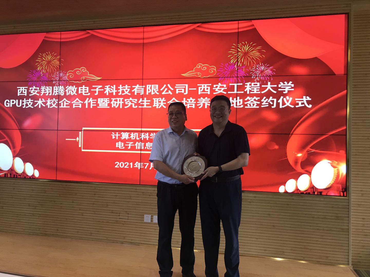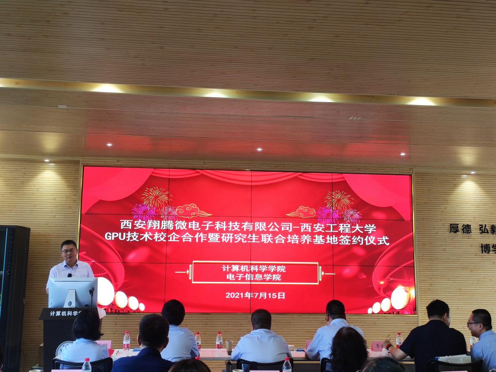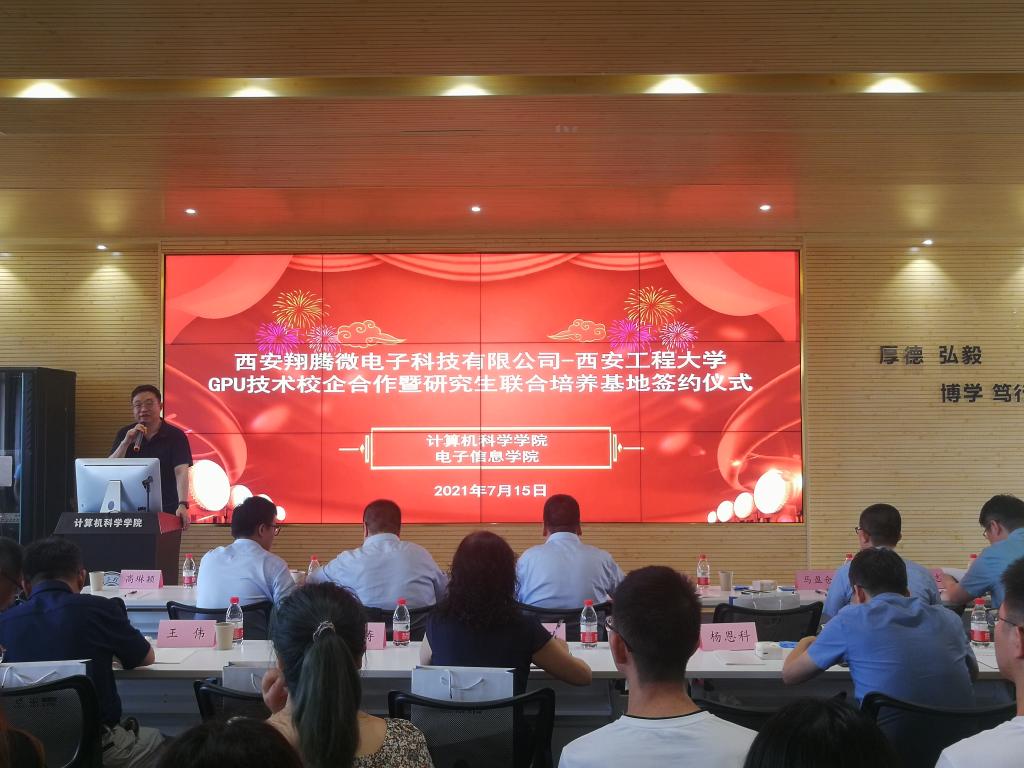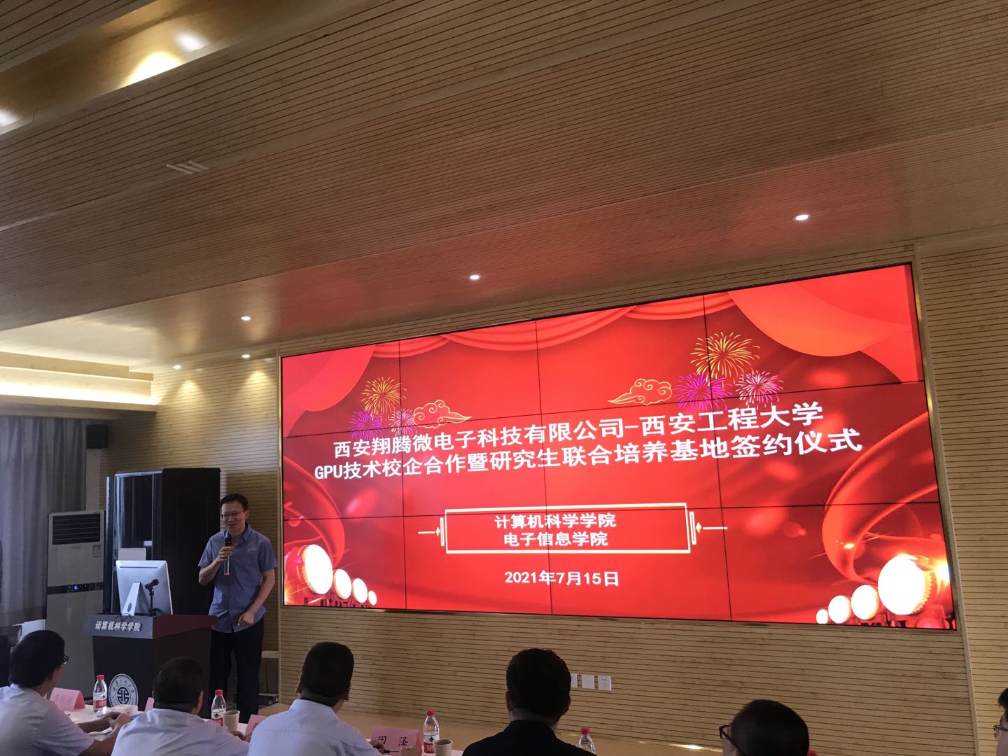 2021年7月15日上午,西安工程大学与西安翔腾微电子科技有限公司GPU技术校企合作暨研究生联合培养基地签约揭牌仪式在计算机学院614学术报告厅举行。西安工程大学副校长李鹏飞、西安翔腾微电子科技有限公司总经理田泽、副总经理邵刚、相关技术负责人、西安工程大学研究生院、科技处、校友会负责人、计算机学院、银河6163线路检测负责人等领导及师生代表80余人出席仪式。签约揭牌仪式由计算机学院薛涛院长主持。