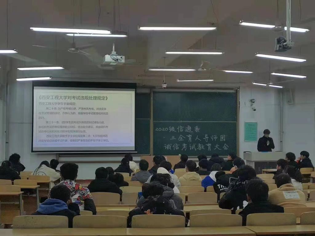 为了进一步加强同学们的考风考纪,构建诚信校园,保证期末考试的顺利进行,倡导同学们“端正考风、严肃考纪、文明答题、诚信应考”。2021年12月10日19时,2020级信通系三全育人导师团在教学楼D-233教室召开了“诚信考试 从我做起”活动,2020级电子信息工程专业、通信工程专业全体学生参与了本次活动。