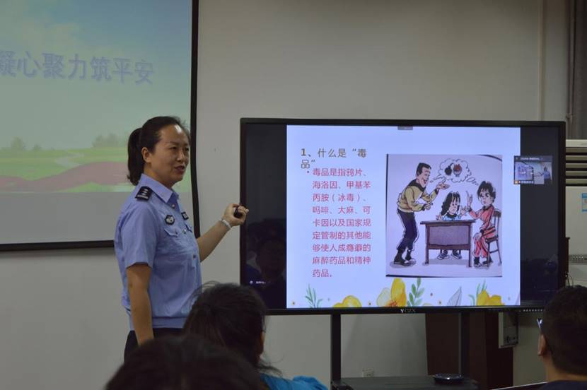 吕欣警官向大家普及了禁毒知识。通过具体案例、展示毒品图片、讲解禁毒知识及相关法律法规等,帮助大家了解了什么是毒品、毒品的危害以及毒品成瘾的过程,同时也明确指出了大家对家庭用药安全的常见误区,提醒大家一定要警钟长鸣。