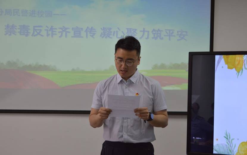 杨松然主持会议。他以大学生防毒反诈意识薄弱的现状为切入点,指出了禁毒反诈宣讲的重要性,拉开此次活动序幕。