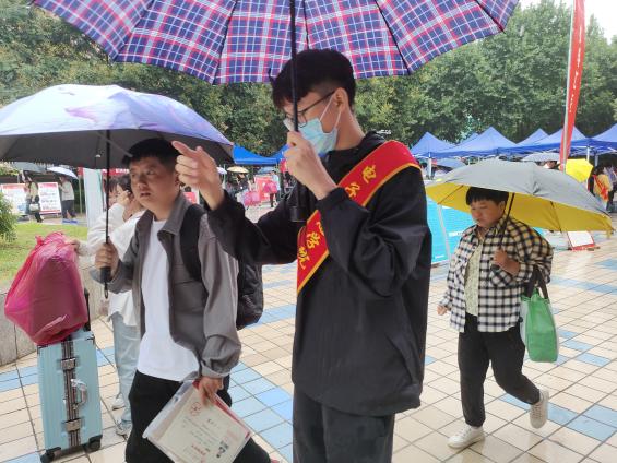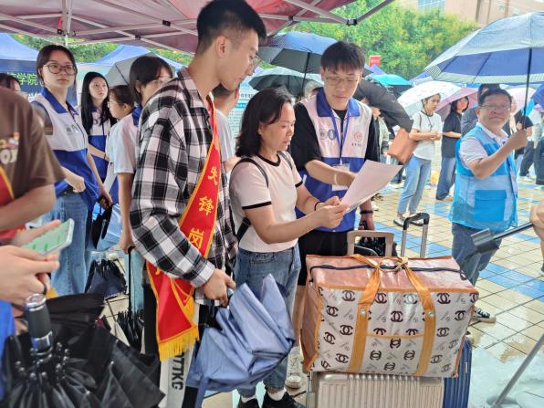 志愿者们早早便来到迎新现场,拉横幅,支帐篷,准备物资,以满满的活力等待着同学们的到来,热情引导新生报道注册,帮助他们搬运行李入住。整个迎新工作有条不紊、井然有序,真正做到了学生暖心、家长放心。