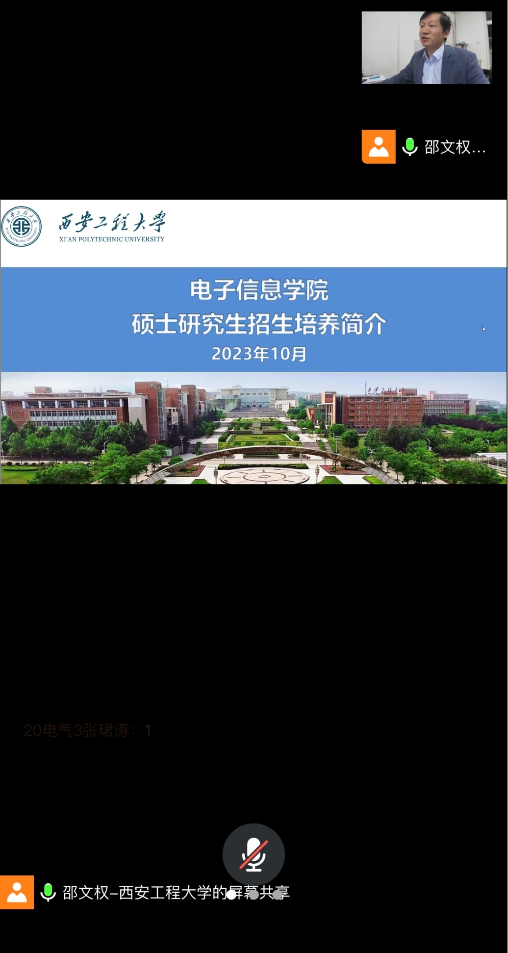 邵文权教授详细介绍了电信学院基本情况、学科特色及优势、研究方向、师资力量、科研实力等方面的情况。通过招生政策宣讲,在线回复考生关切问题,让考生对我院研究生招生政策、研究生培养、各学科的优势、科研能力以及导师等方面的情况有了更加直观的了解,大大增加了考生报考西安工程大学的信心和决心。