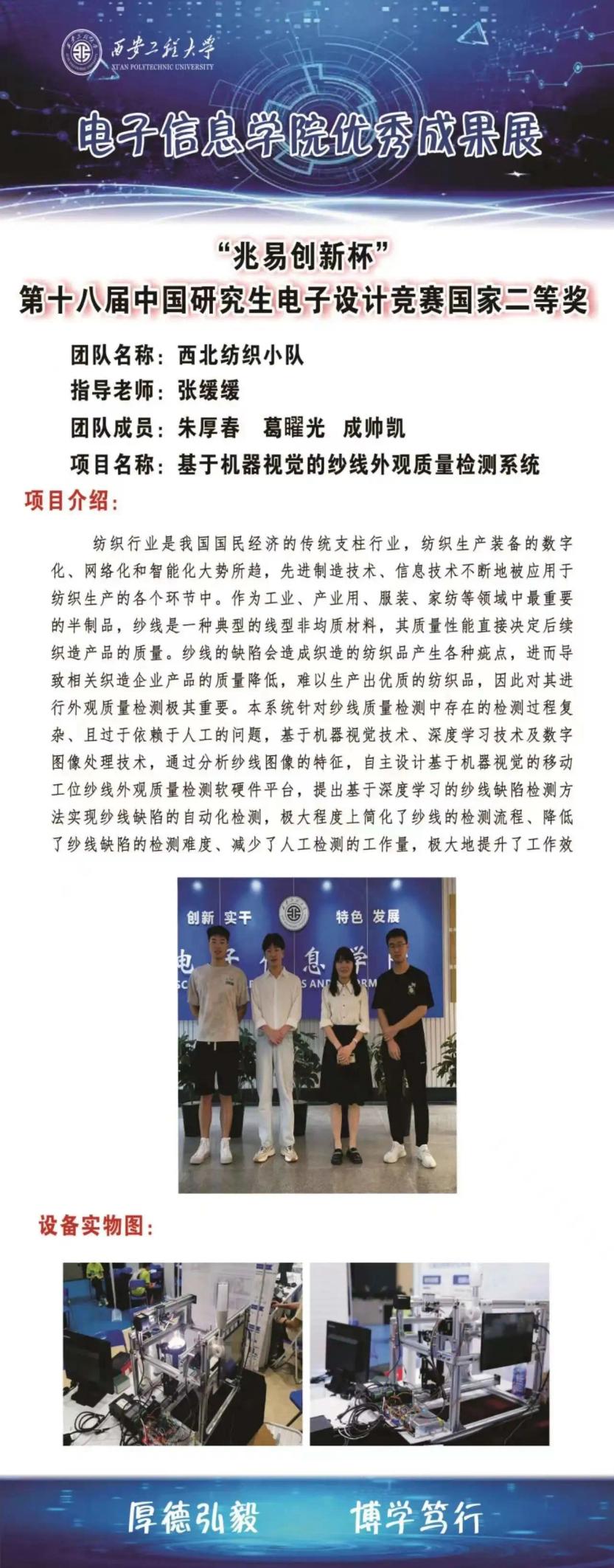 葛耀光同学本次分享的题目是《基于机器视觉的纱线外观质量检测系统》。他首先讲述了参赛前期的准备工作,重点分享了自己参赛题目的选择,从企业实际需求出发能切实解决企业实操问题。他自己的团队通过实地走访纺织工作车间,分析车间的工作流程,发现车间存在工作空间狭窄、光线差、温度高、设备噪声大等实际问题,工厂所用人工检测成本高,检测效率慢迫切需要改进,他选择的课题有很重要的实用价值。