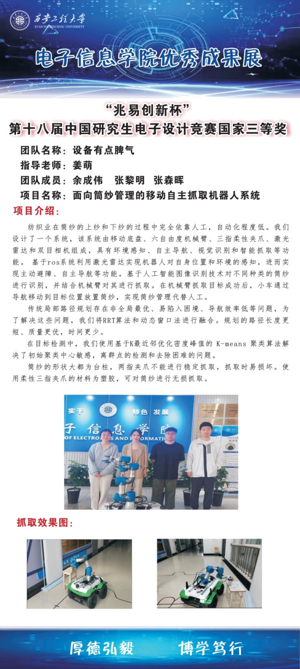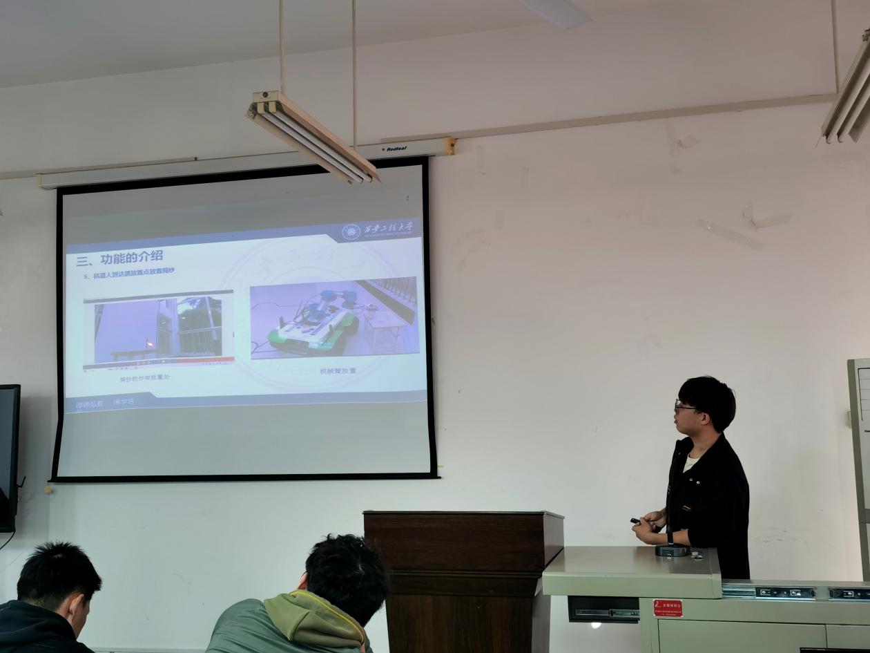 余成伟同学本次分享的主题是“面向筒纱管理的移动自主抓取机器人系统”,他从研电赛赛前的准备工作、系统的设计、功能的介绍、以及作品的创新点等方面分享了自己参赛的经验。他强调电子设计竞赛不是一个孤立的竞赛,它是同我们电子相关专业的课程密切结合的,是专业课体系化的过程,与培养自身全面素质是紧密相关的。参加研电赛不仅仅是得到一次比赛经历,更多的是一种能力和意志力的考验,更是专业知识与实践相结合的演武场。最后他鼓励计划参加研电赛的学弟学妹可以一直坚持下去,并预祝师弟师妹们在明年的赛事中取得好成绩。