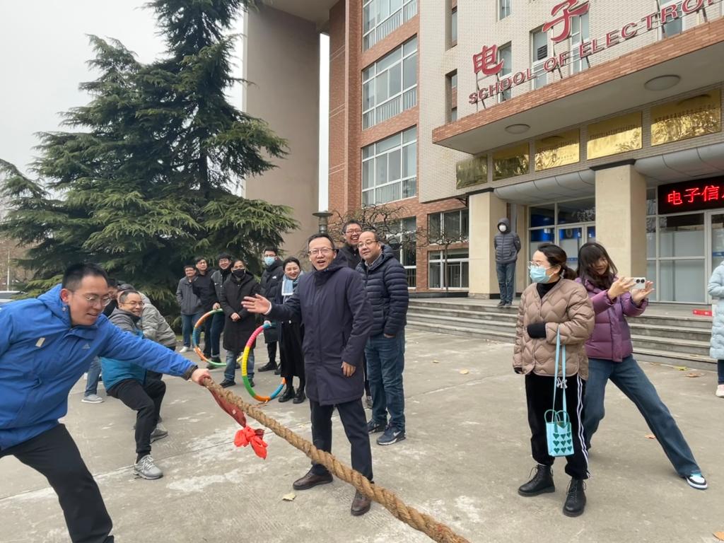 全院共有100名教职工积极参加比赛,活动现场气氛热烈。活动在电信楼下举行。其中包括拔河、跳绳和呼啦圈等多项有趣的运动项目。教职工们形成了欢快的团队,在友谊和竞争中度过了一个愉快且充满活力的中午。